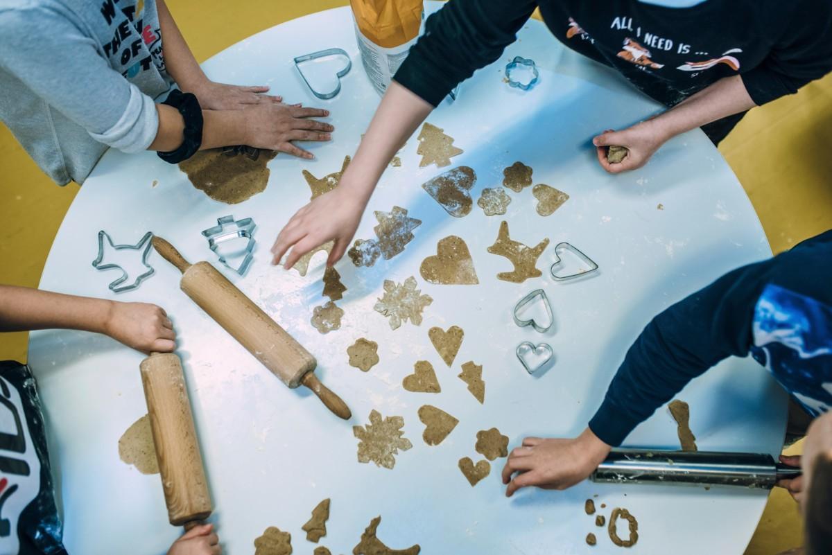 Maatullin koulaiset leipovat pipareita vanhuksille. Käytössä on monenlaisia muotteja.