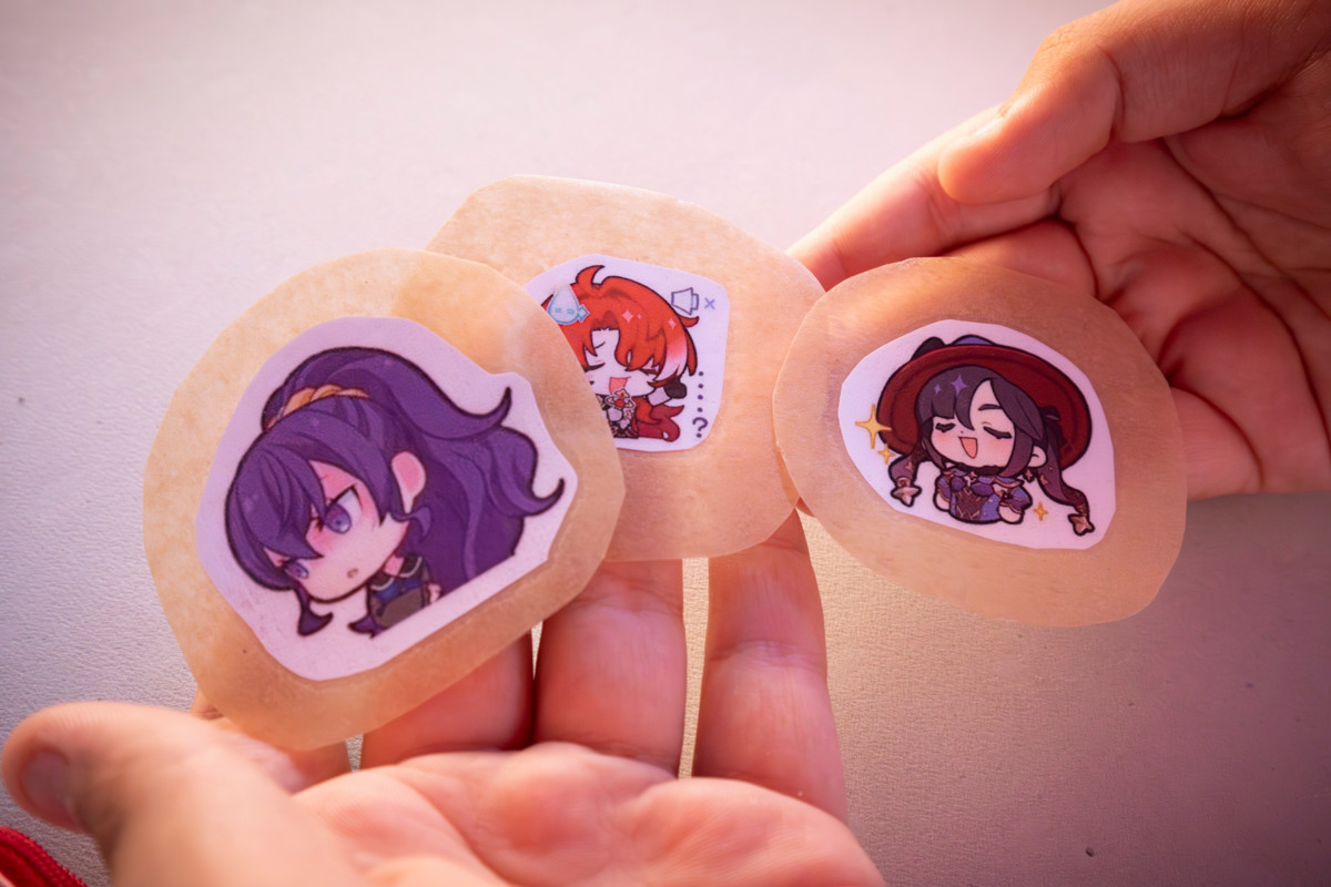 Kävijät tekivät itse animepelitarroja suosikkihahmoistaan, ja antoivat niitä toisille kävijöille.