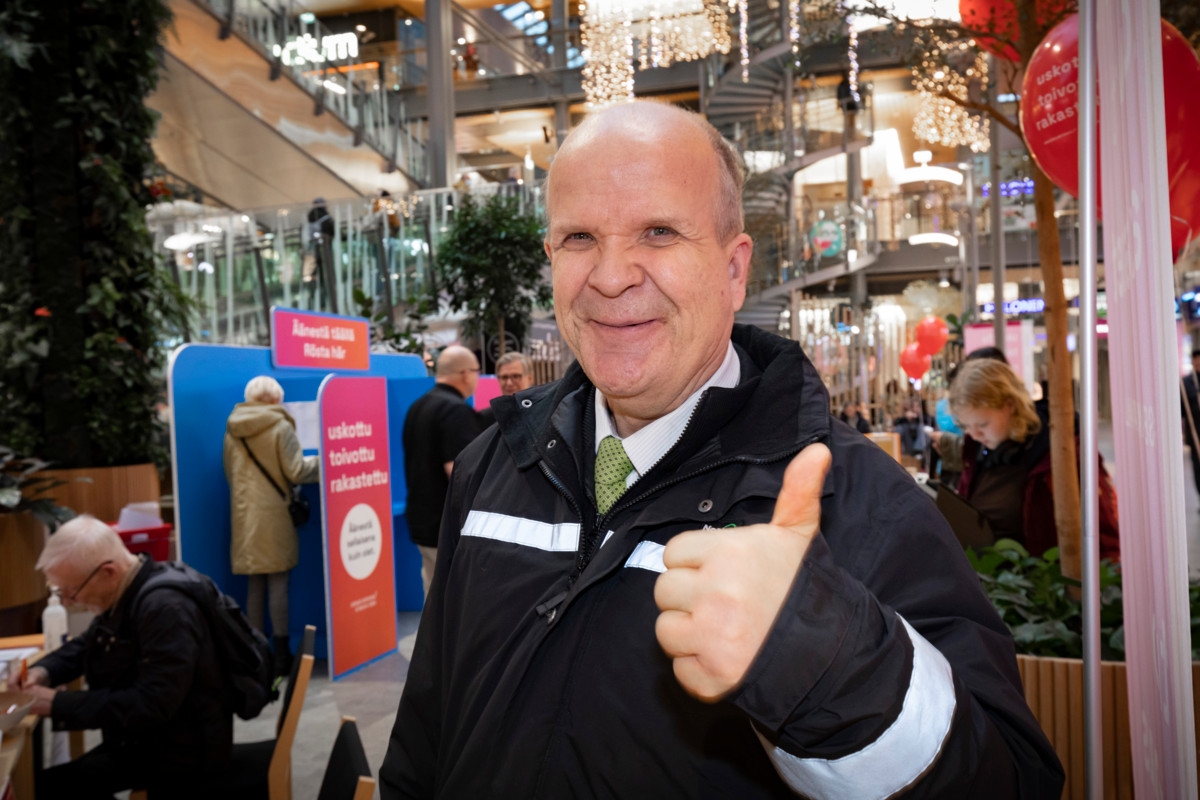 Helsinkiläinen Olli Siitonen on juuri päättänyt työpäivänsä ja äänestää Sellossa, joka osui sopivasti reitin varrelle.