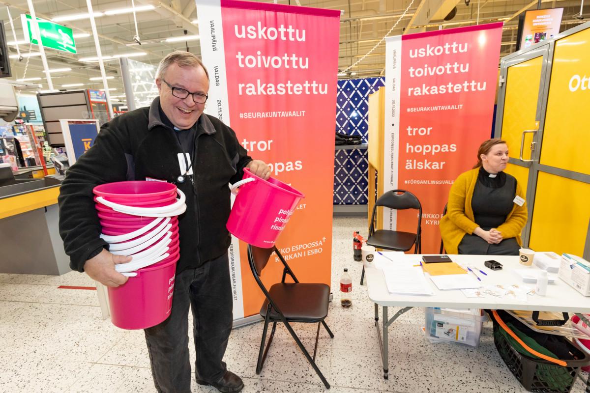 Espoon tuomiokirkkoseurakunnan äänestyspisteellä K-market Lähderannassa äänestäjille on tarjolla sekä heijastimia että pinkkejä vaaliämpäreitä, joissa on teksti ”Pohjalla, pinnalla, rinnalla”.