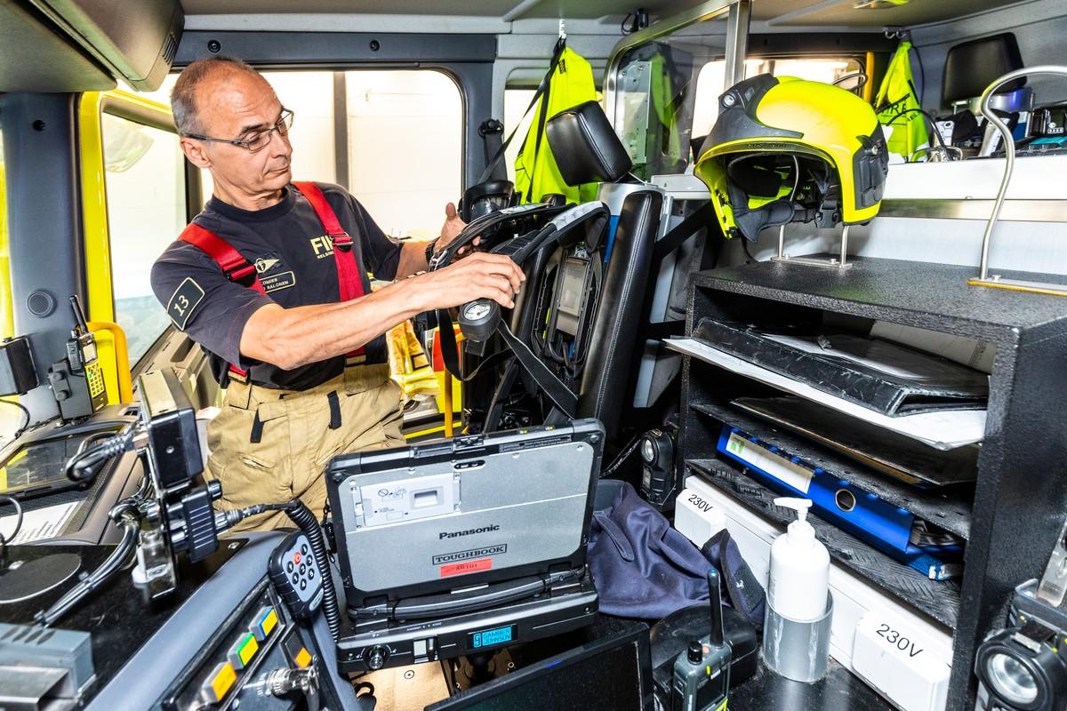 Markku Salonen näyttää paloauton kalustoa, kuten istuinta, johon on valmiiksi integroitu savusukelluksessa tarvittava varustus.
