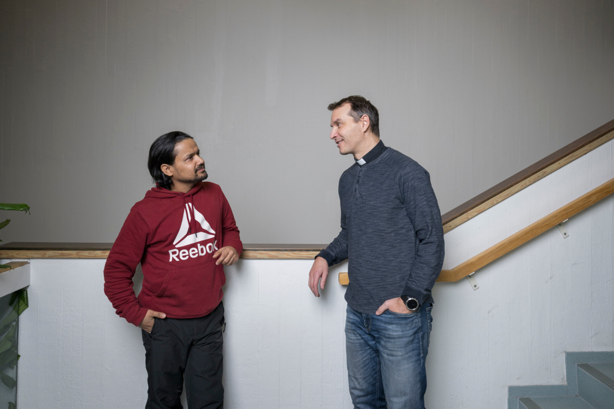 "Kansainvälisten opiskelijoiden on monesti helppo tukeutua pappiin omasta uskonnollisesta taustastaan riippumatta", Panu Mäkelä (oik. ) sanoo. Opiskelija Priyash Pokharelin uskonto on hindulaisuus.