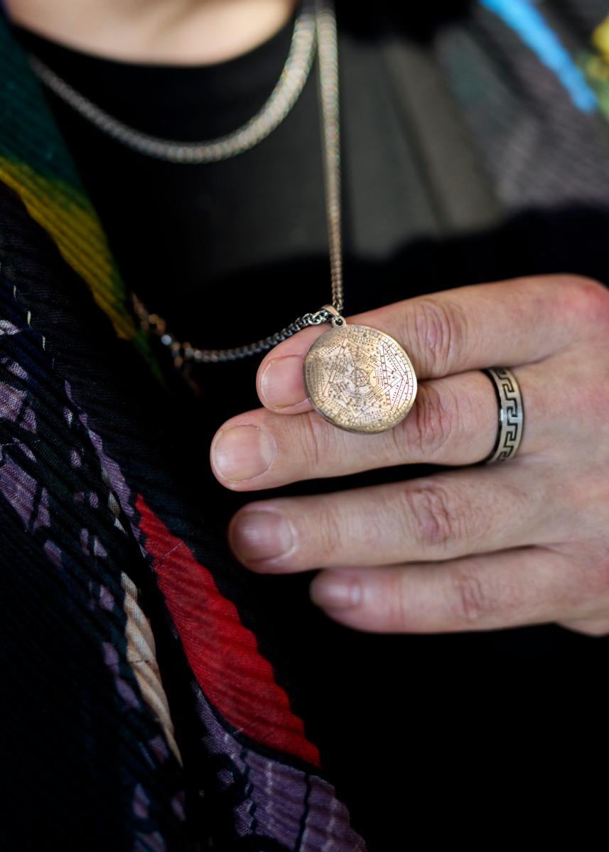 Ja kun nyt enkeleistä tuli puhe, Yrjänä esittelee kaulariipuksensa. Sen kuvio on Sigillum Dei Aemeth, Jumalan pyhä sinetti, jonka englantilainen matemaatikko ja astrologi John Dee teki tunnetuksi 1500-luvulla.