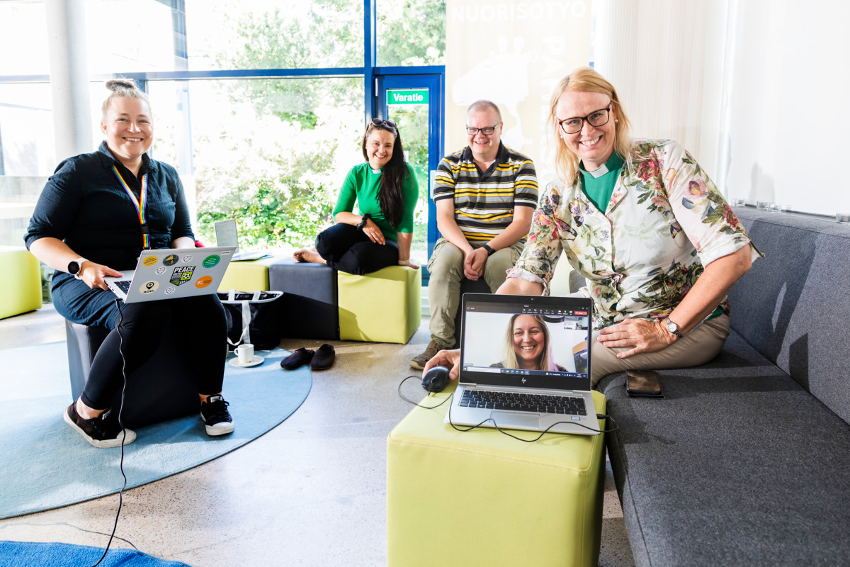 Ukrainalaisten ja arabiankielisten auttamista suunnitellaan palaverissa, johon osallistuvat Menni Nousiainen (vas.), Johanna Harjunkoski, Markus Silvola ja Anna Handroo. Tatyana Pitchulina on mukana etäyhteydellä.