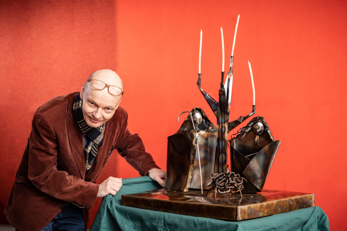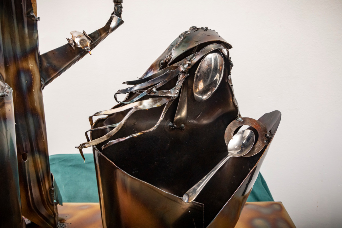 Juha Luodeslampi valmisti seimiasetelman kierrätetystä metallista. Työ on esillä Kirkon talon (Eteläranta 8) katutasossa perjantaihin 6.1. saakka.