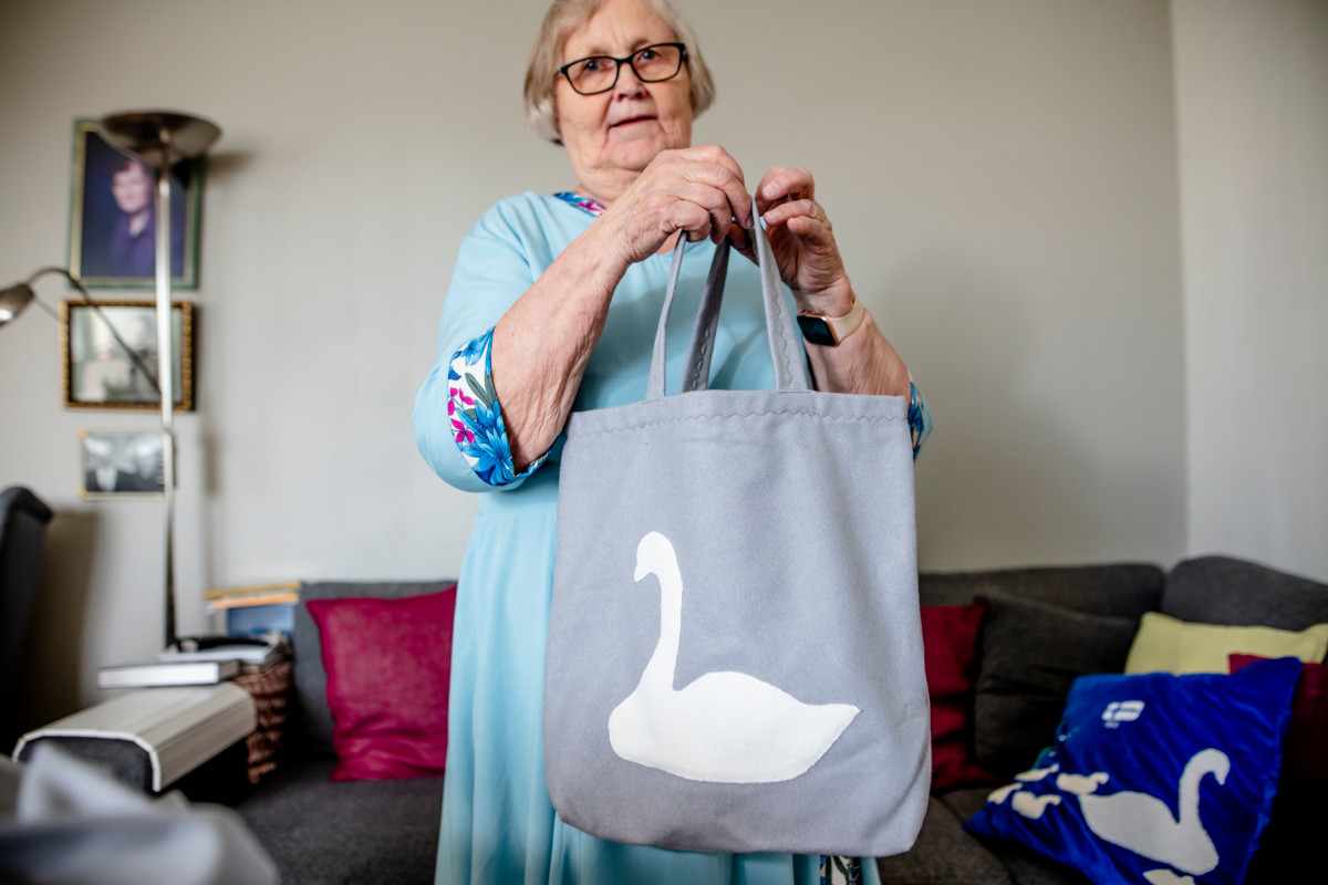 Aira Kosonen, 77, asuu Helsingin Tapulikaupungissa. Hän on ommellut arkkupeiton ja tuhkapussin, jotka haluaisi lahjoittaa jonkin hautausmaan käyttöön.