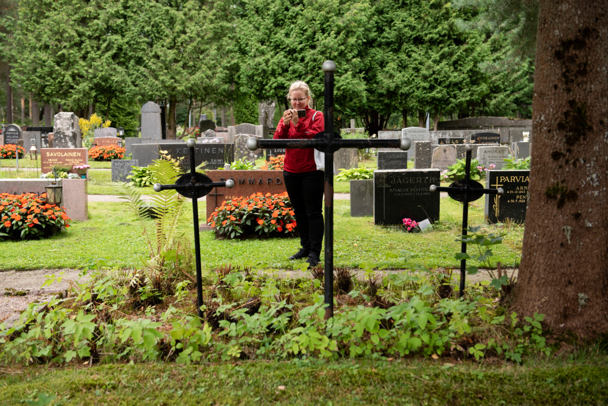 Heli Haavisto ottaa kuvaa arkistoonsa kolmen rautaristin haudasta. Hautausmaan portit 1800-luvun lopulla tehneen seppämestari Paleniuksen hauta on tässä.