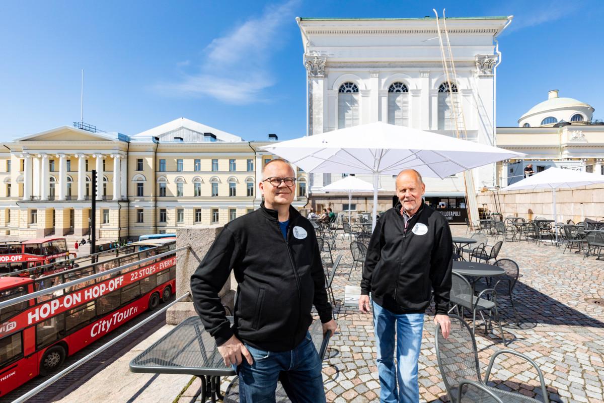 Ravintoloitsijat Petri Laitinen ja Kaj Kuhlefelt toivovat aurinkoisia ilmoja, jotka toisivat turisteja ja muita asiakkaita ravintolaan ja kahvilaan. He kiittävät seurakuntaa hyvästä yhteistyöstä.