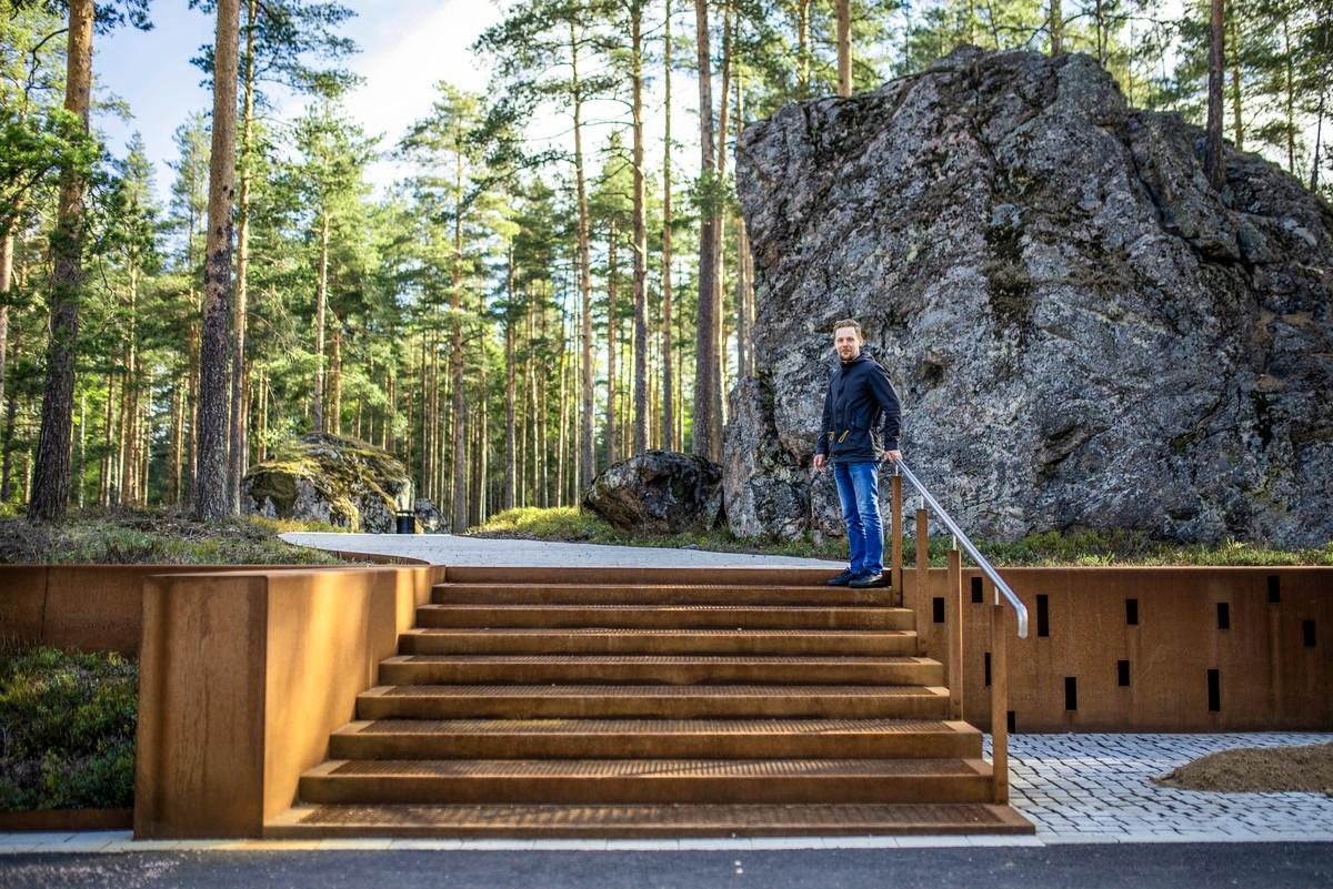 Ylipuutarhuri Marko Laakso metsähauta-alueen pääsisäänkäynnin luona.