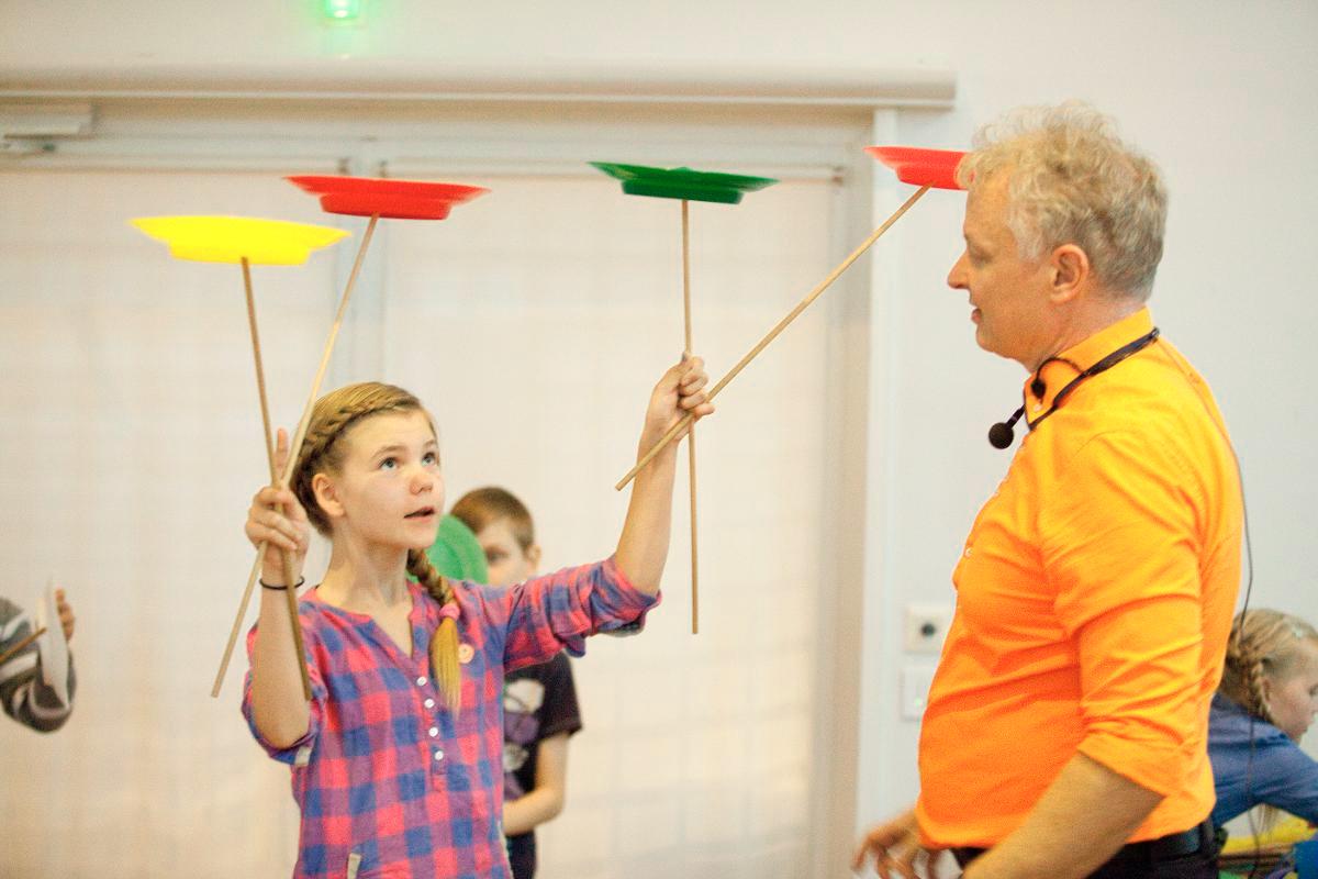 Minttu Pekanpalo kokeili, miten lautaset saa pyörimään keppien päässä. Taika-Petteri eli Petteri Hakanen opastaa. Kuva: Sini Pennanen