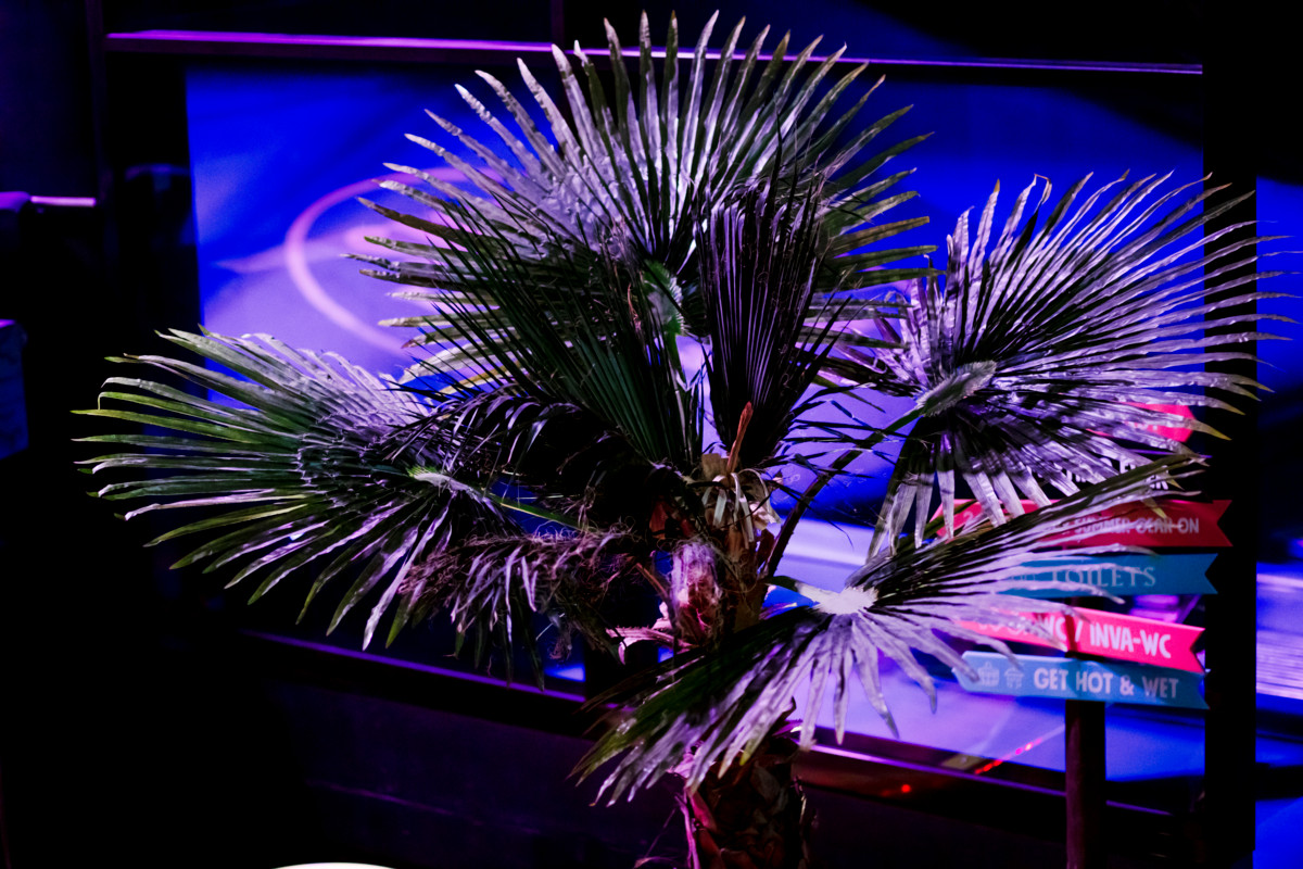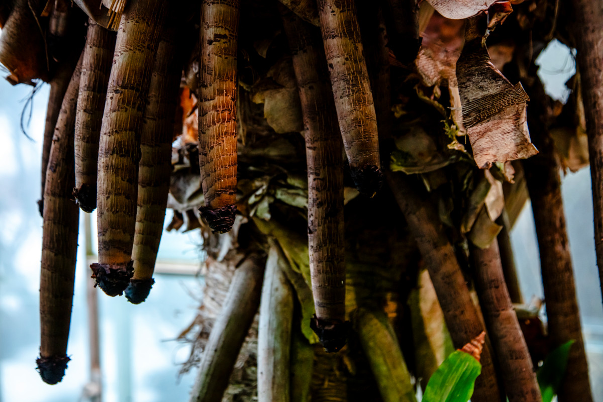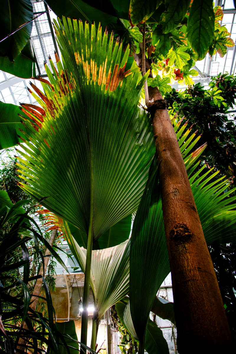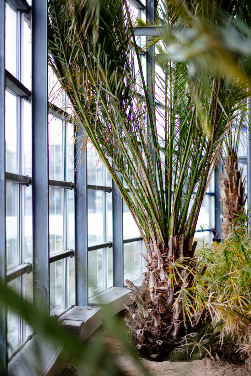 Suurin taatelipalmu vaikuttaa sisäpuutarhassa valtavalta. Se on ehkä kymmenkunta metriä korkea ja yhtä leveä. Ananasmaisesta rungosta erkanevat lehdetkin ovat monen metrin mittaisia.