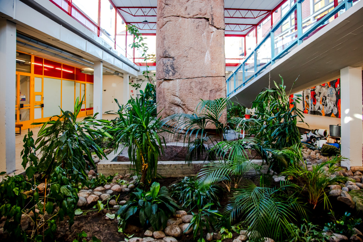 Menen katsomaan taatelipalmuja. Viikin kampuskirjaston Niilin puutarha -kyltin alla olevasta ovesta pääsee suureen, viileään, kolmionmuotoiseen viherhuoneeseen, jossa palmujen ryhmyläiset rungot nousevat vaaleasta hiekasta.