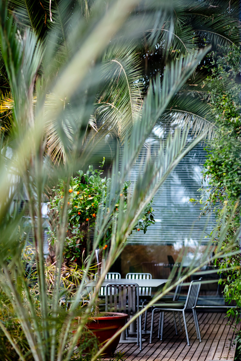 Eksoottisessa sisäpuutarhassa ei ole maaliskuisena arkiaamuna ketään muita, mutta on kolme pientä pöytää ja yksitoista tuolia niiden ympärillä. Vieressäni seisovassa puussa kasvaa oransseja hedelmiä. Osa kasveista reunustaa vesiallasta.