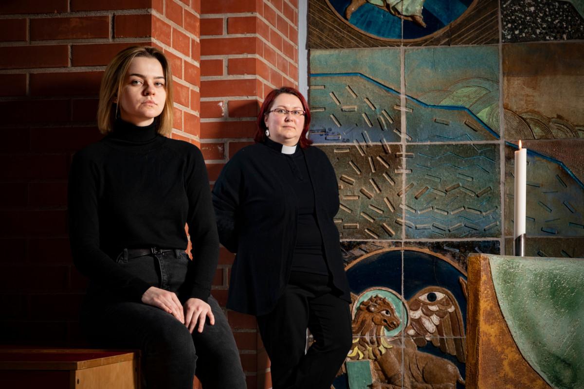 Tatiana Butserka ja pappi Anna Lewing Matteuksen kirkolla, jossa venäjänkielisellä seurakuntayhteisöllä on paljon toimintaa. Butserka on huolissaan ukrainalaisesta isästään.