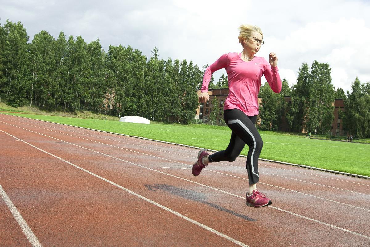 Vauhdissa. Mari Tirkkonen tekee eritempoisia juoksuharjoitteita Otaniemen urheilukentällä. Kuva: Patrik Lindström |