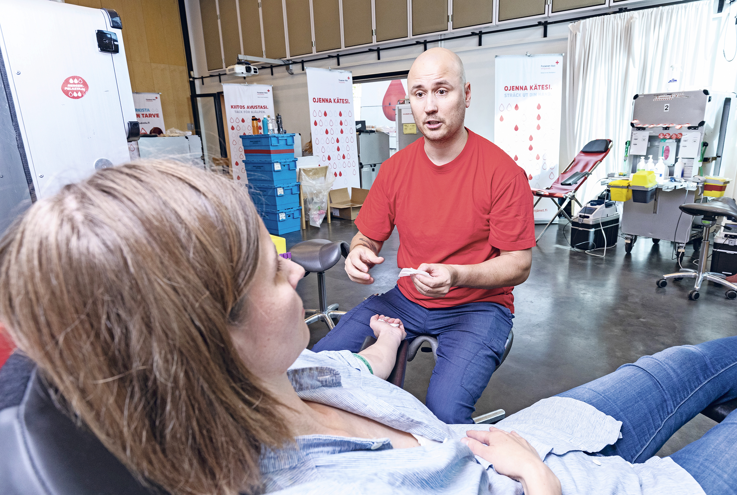 Liikkuvan veripalvelun yhdeksän sairaanhoitajaa ovat olleet tehokkaita: pop-up-luovutuspiste kaikkine koneineen, pusseineen ja kylmälaatikoineen on tänään, kuten joka päivä, pantu pystyyn alle tunnissa. Verenluovutus on tänään mahdollista neljän ja puolen tunnin ajan, ja jokaiselle vartille on jaossa neljä aikaa.