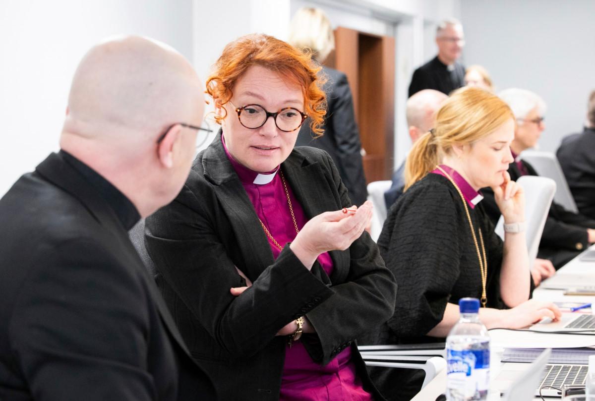 Piispat valmistautumassa piispainkokoukseen. Mikkelin piispa Mari Parkkinen (kuvassa toinen vasemmalta) vihittiin piispaksi samana päivänä, jolloin naisten pappeutta vastustavien järjestöjen miespuolisia työntekijöitä vihittiin papeiksi Inkerin kirkossa Pietarissa. Kuva Aarne Ormio / Kirkon kuvapankki.