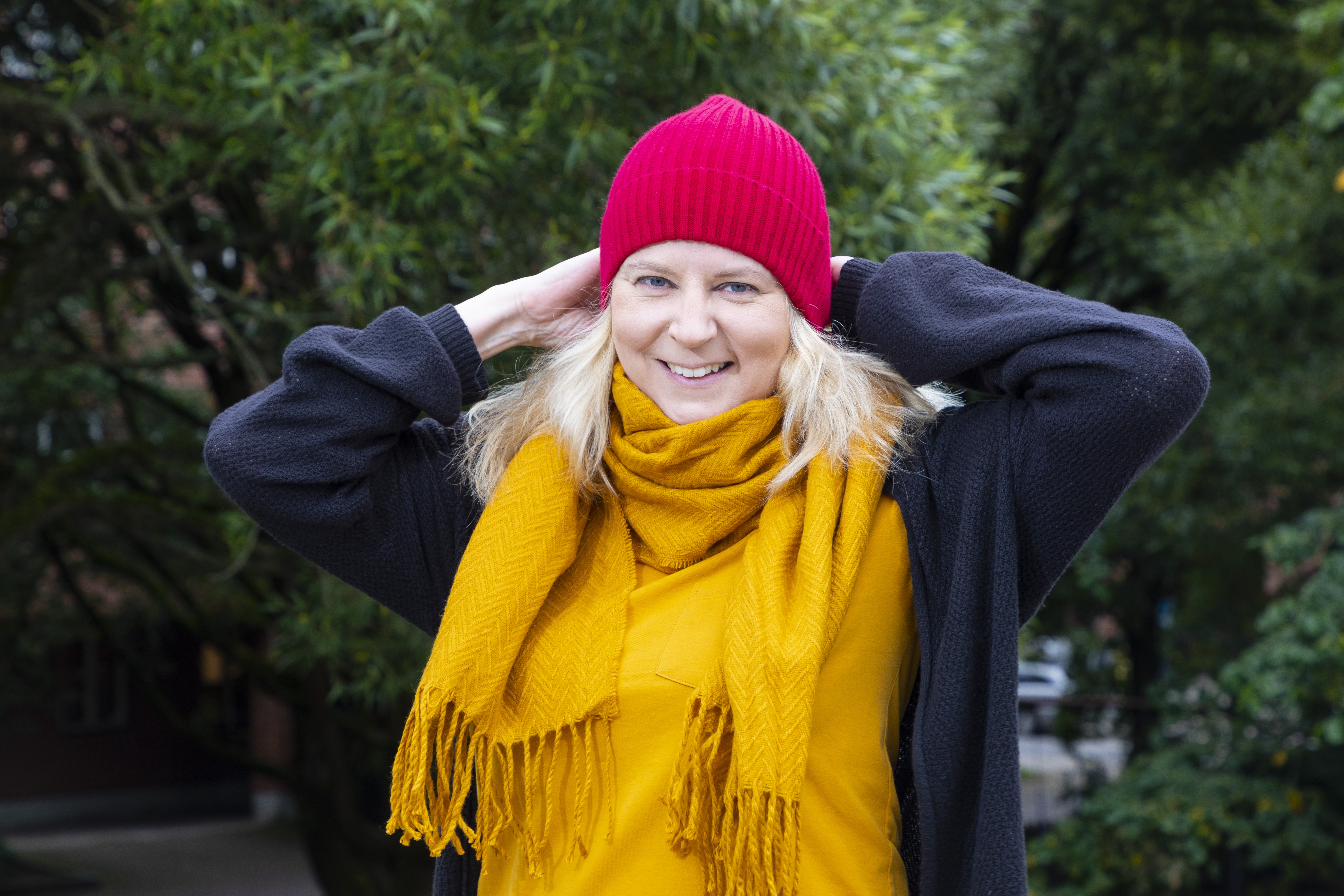 Katri Saarela valmistautuu uusiin tehtäviinsä sovittamalla jo joulukauden pipovarustusta.