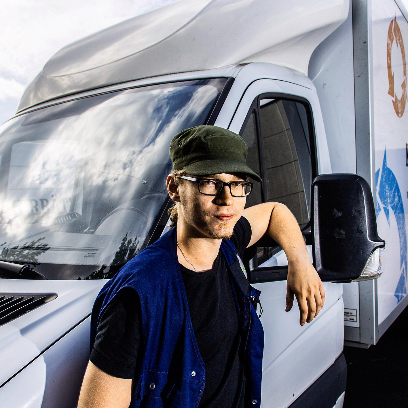 Juho Kojolle duunipaikka irtosi helposti. Hän oli aiemmin työskennellyt tapahtumamarkkinoinnin ja matkailun alalla, mutta Espoon nuorisotyössä suositeltiin Kierrätyskeskusta. Kojo haki ja pääsi parissa päivässä haastatteluun. Hän ajaa Kierrätyskeskuksella sekä isoja että pieniä autoja. Kaikkiaan pääkaupunkiseudulla kiertää 12 noutoautoa.