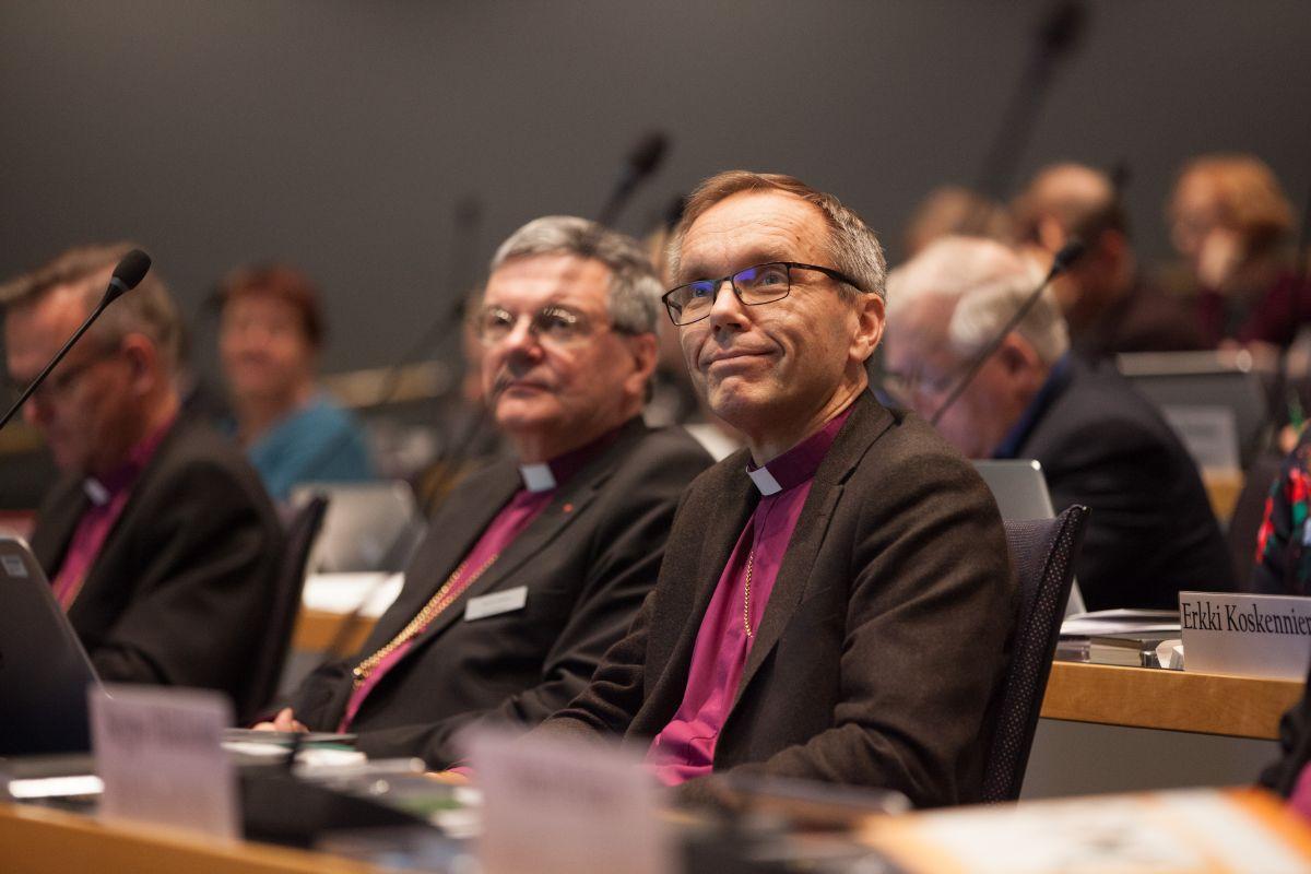 Piispa Björn Vikström ei suostunut allekirjoittamaan perustevaliokunnan mietintöä, joka vastusti kirkollisen avioliiton avaamista samaa sukupuolta oleville pareille. Kuva on kirkolliskokouksesta viime syksyltä.