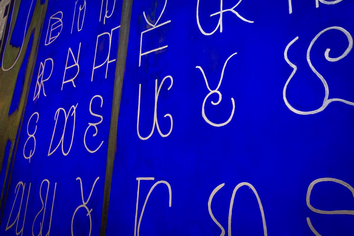 Sininen teos on kahdesta paneelista rakennettu: vasemmalla kolme hahmoa kuvaavat Isää, Poikaa ja Pyhää Henkeä, ja oikealla on 36 monogrammia. Ne eivät siis ole mitään kieltä.