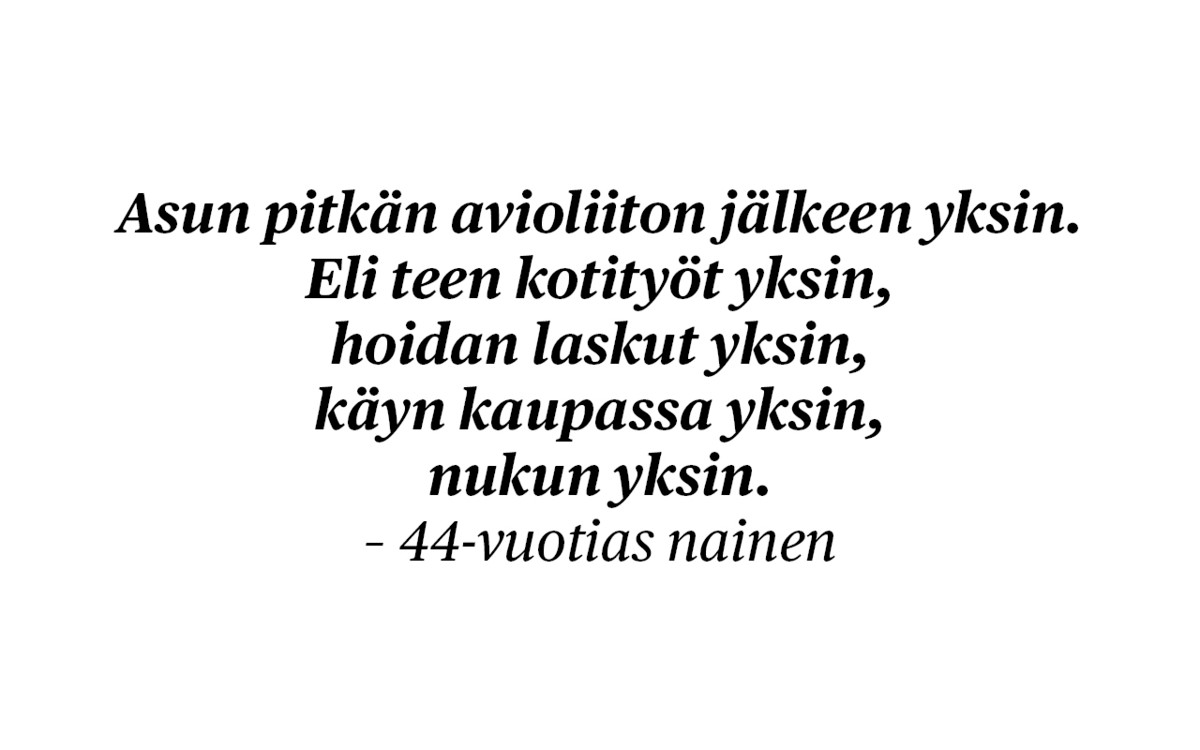 ”Ei ole ketään juttukaveria eikä ketään kiinnosta olenko edes elossa”, kiteyttää 47-vuotias nainen.