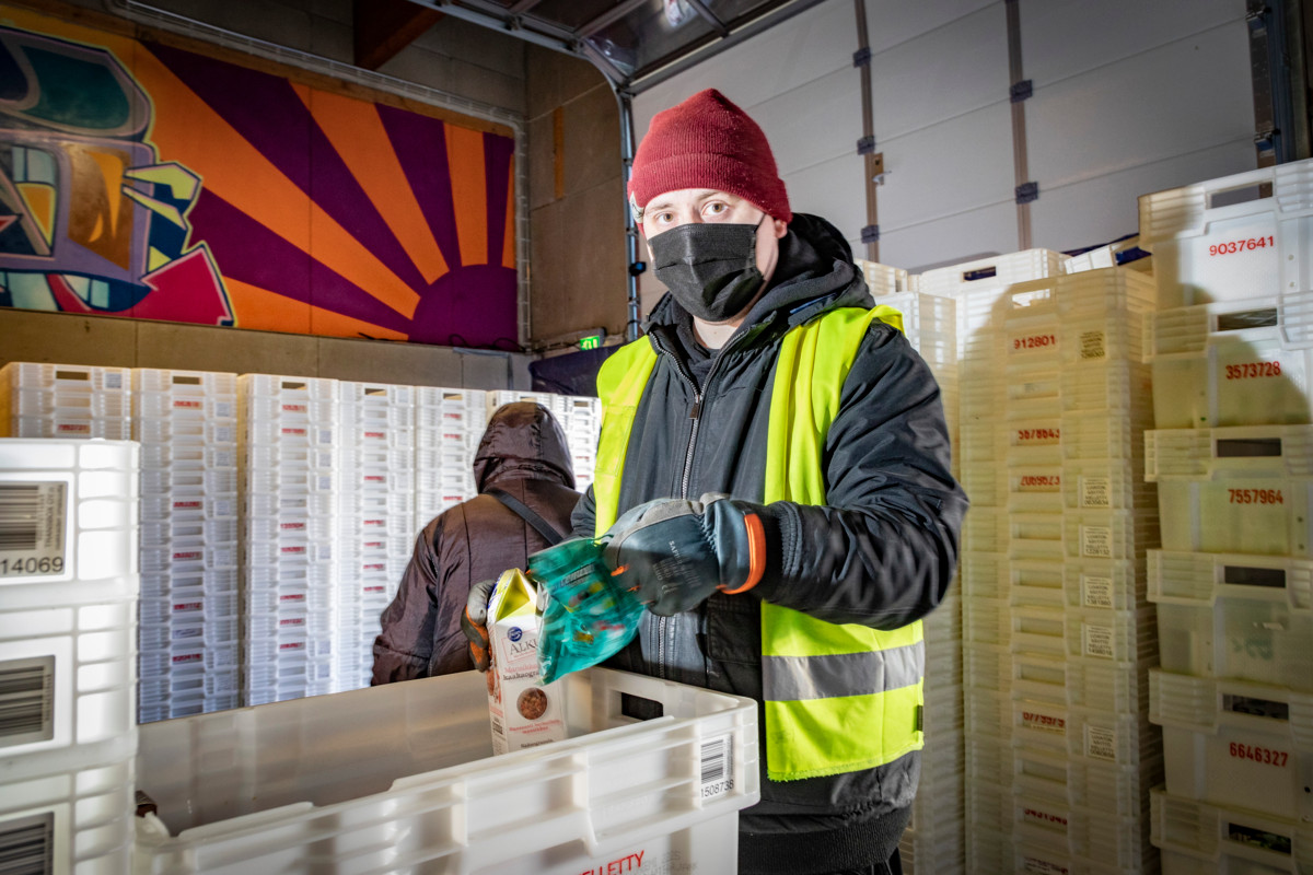 Myllypuron elintarvikeapu ry:n työntekijä Tomi Rantanen ojentaa ruokakasseja hakijoille. Pandemia-aikana heitä on saapunut keskimäärin tuhatkunta yhdellä jakokerralla. Ennen pandemiaa ruoanhakijoita kävi 1500–1900 päivässä.