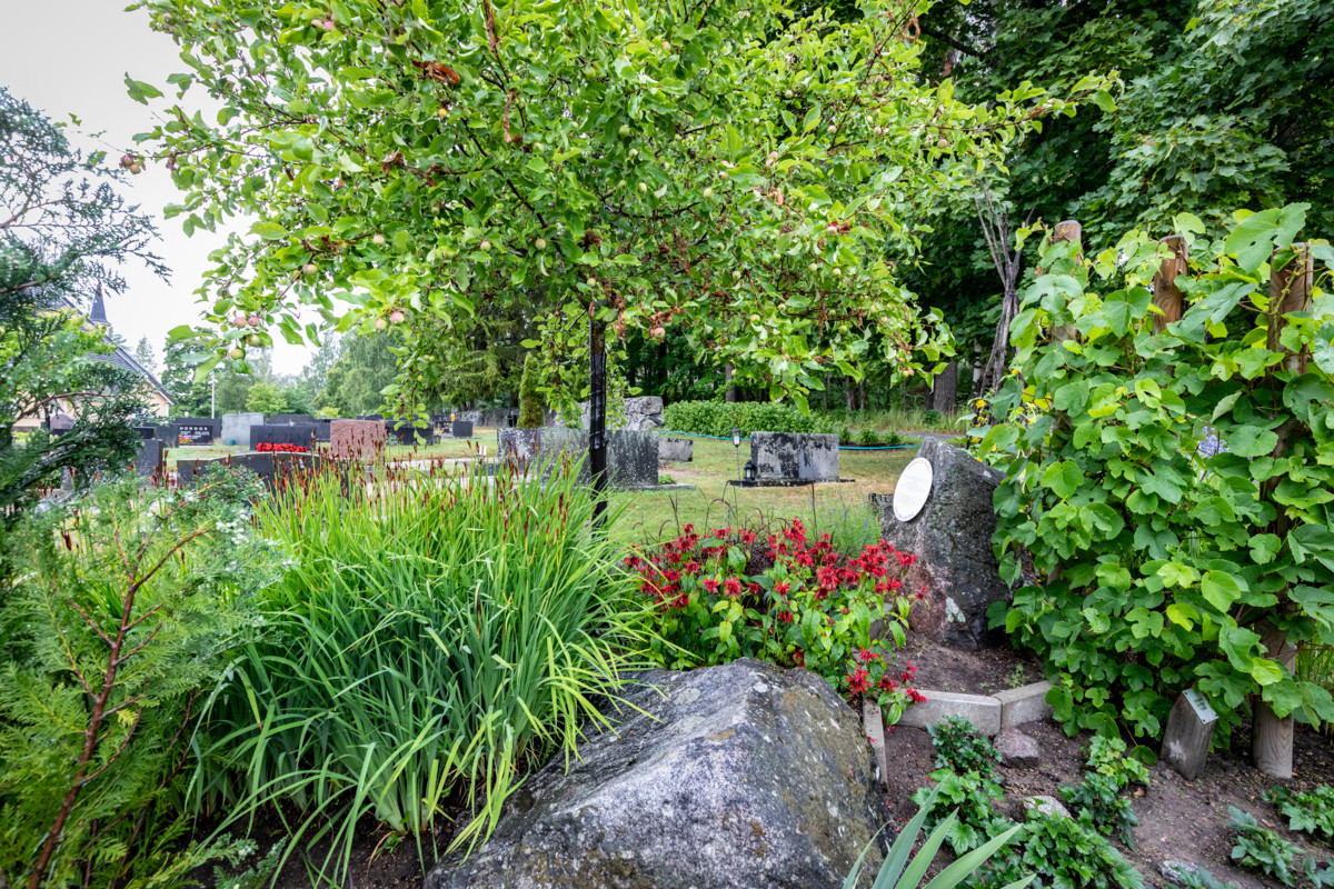 Östersundomin hautausmaan laidassa voi käydä tutustumassa raamatullisiin kasveihin. Keskellä kasvaa omenapuu.