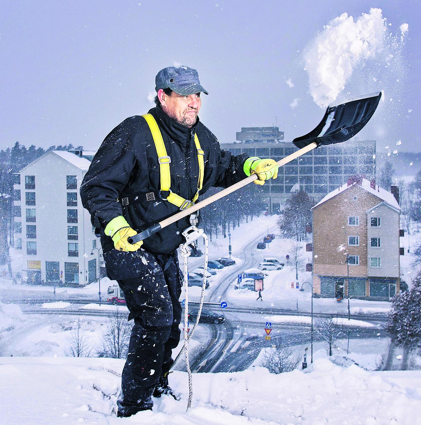 Lumi pöllähtelee, kun Jorma Repo työtovereineen pudottelee täysiä lapiollisia jalkakäytävälle Munkkiniemen puistotie 19:n katolta. Taivaalta tupruttaa lisää, mutta putoamisvaarassa oleva lumimassa on saatava alas kuusikerroksisen talon katon reunalta.
