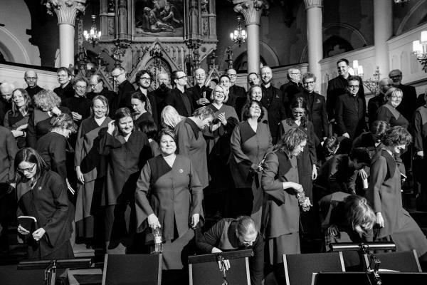 Suomen Laulun harjoituksia kuvattiin helmikuun lopussa Temppeliaukion kirkossa sen harjoitellessa Faurén teosta.