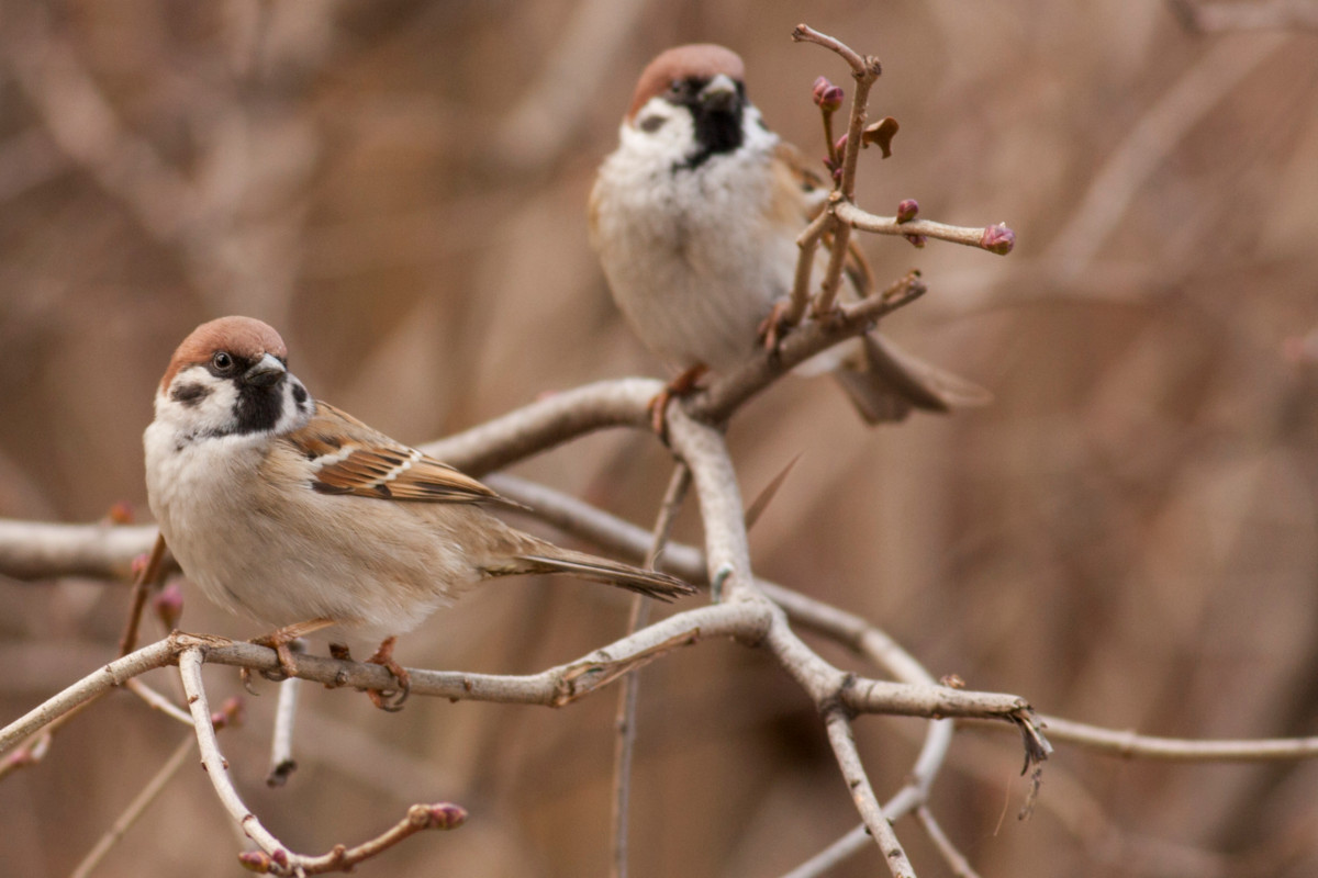 Varpunen on vähentynyt ja pikkuvarpunen yleistynyt elinolojen muututtua. Lintulajit erottaa päälaesta. Ykköskuvan erittäin uhanalaisella varpuskoiraalla on harmaa päälaki ja kakkoskuvan elinvoimaisella pikkuvarpusella ruskea.
