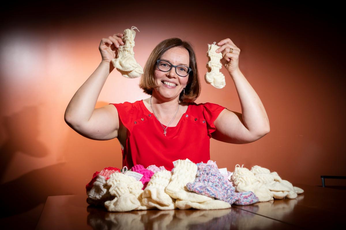 Aila Pihlajavesi esittelee ensimmäisiä vapaaehtoisten neulomia vauvasukkia. Niitä kaivataan vielä lisää.