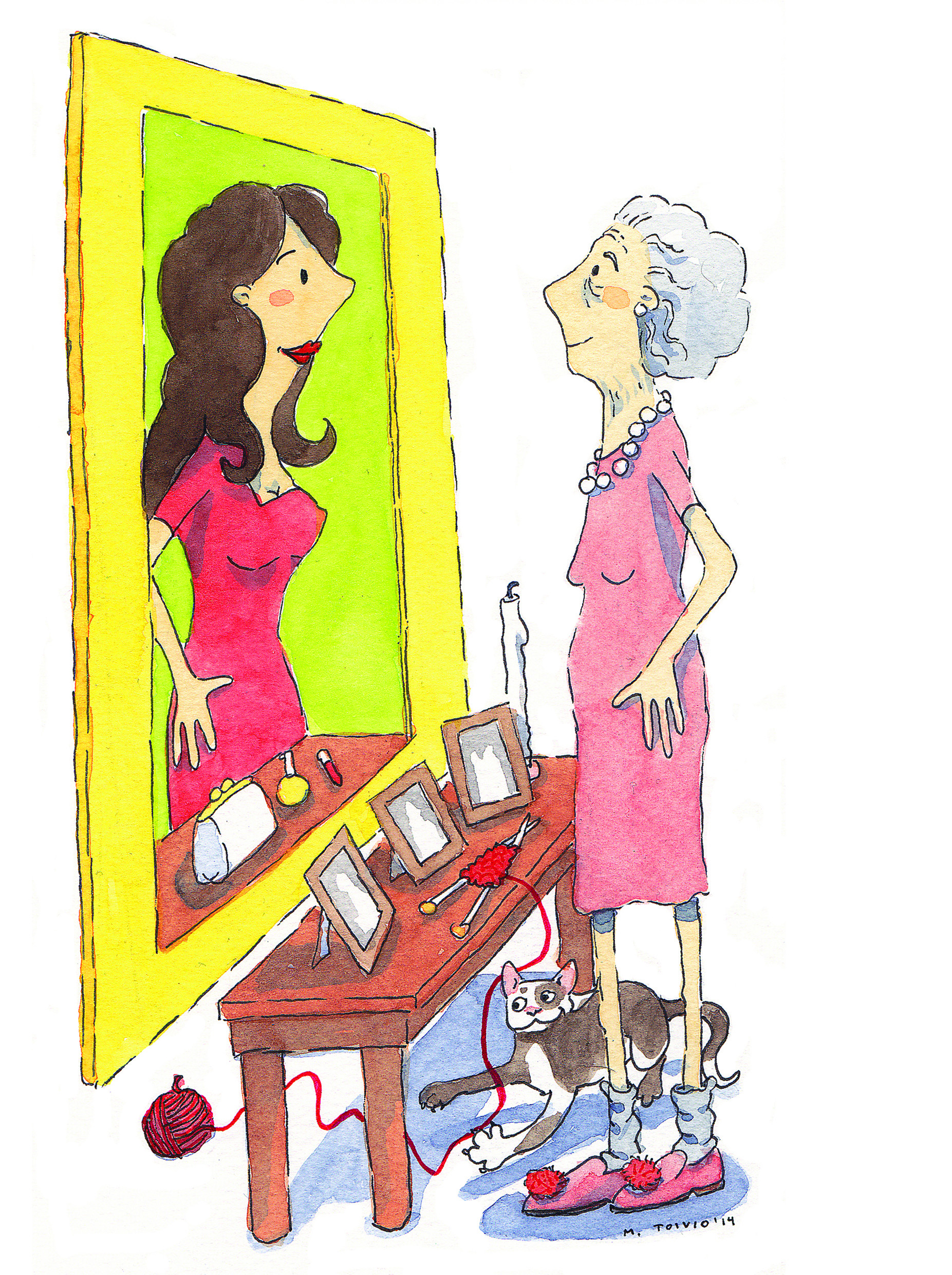 Katselen kasvojani hissin peilissä. Valo on kirkas ja räikeä. Ei pääse pakoon ryppyjä. Ystäväni kanssa hoemme yhdessä: ”Älä katso peiliin, älä katso peiliin.” Nauramme, emmekä katso.
