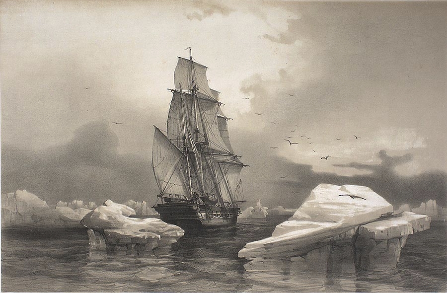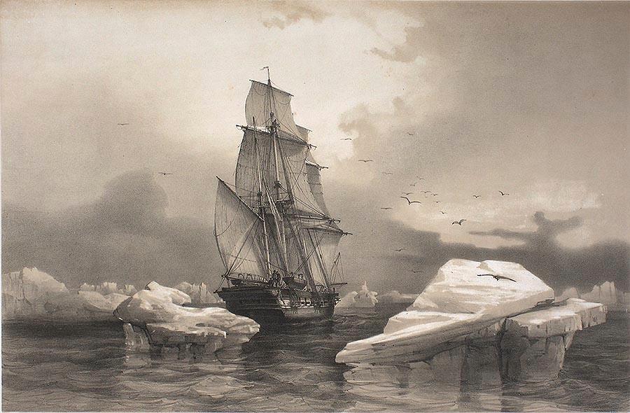 Ranskalainen La Recherche -laiva Huippuvuorilla elokuussa 1838. Kuva: Wikimedia Commons.