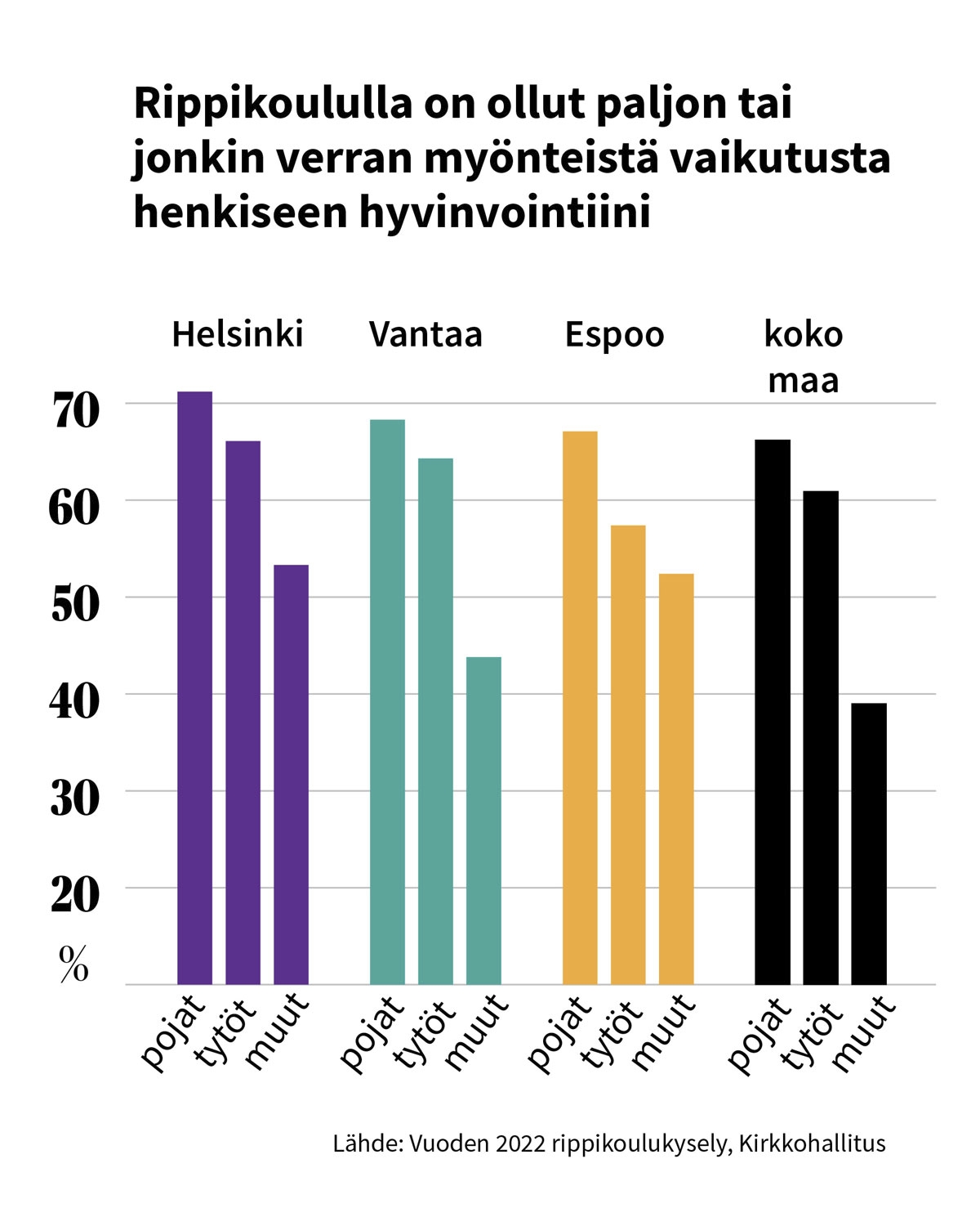 Helsinkiläisten poikien ja vantaalaisten muunsukupuolisten kokemien myönteisten rippikouluvaikutusten välillä on suurin kuilu, 27 prosenttiyksikköä.