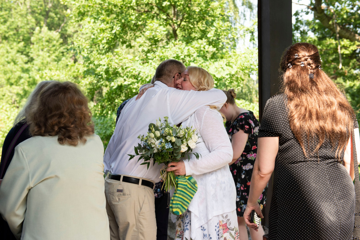 Sari Henriksson ottaa vihkitilaisuuden jälkeen läheiseltään onnitteluhalauksen vastaan.