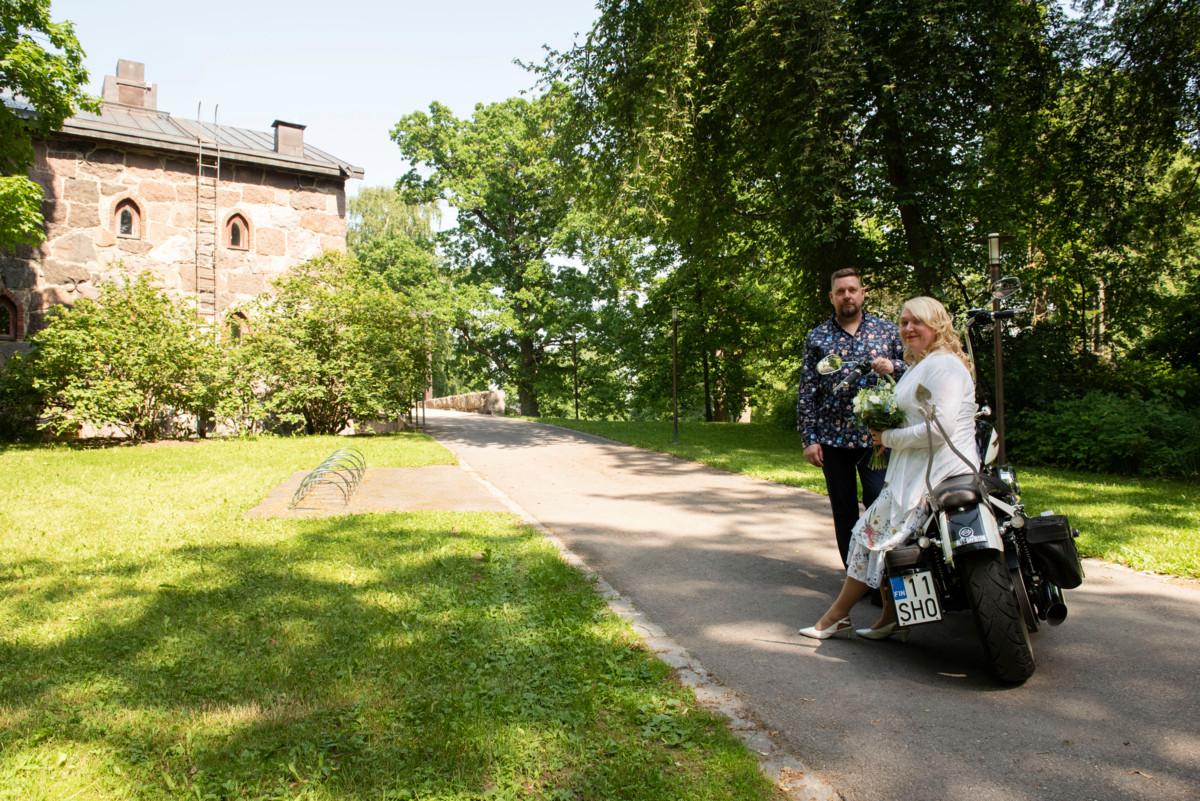 Sari Henriksson ja Tommi Kangas saapuivat Kaarinasta eri matkaa vihkipaikalle Puotilaan. Henriksson taittoi matkan autolla, Kangas moottoripyörällä.