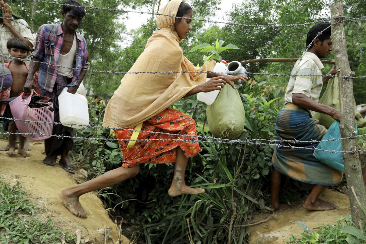Pakolaiset ylittävät piikkilanka-aidan reunustamaa rajaojaa Myanmarin ja Bangladeshin rajalla.