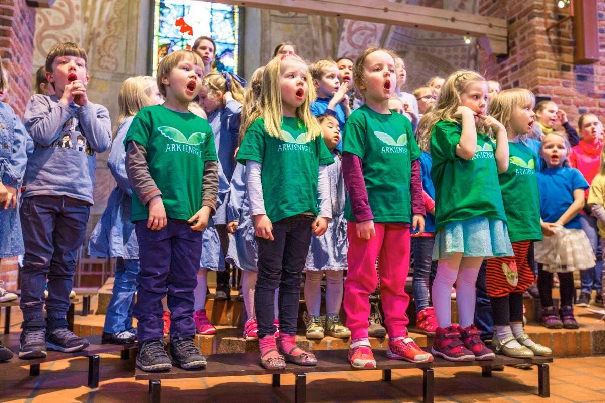 Muskarikuorot eri puolilta maata kokoontuivat laulamaan ja leikkimään Espoon tuomiokirkkoon huhtikuussa. Myös tapiolalaisen Laulusimpukat-muskarikuoron lapset osallistuivat tapahtumaan vihreissä t-paidoissaan.