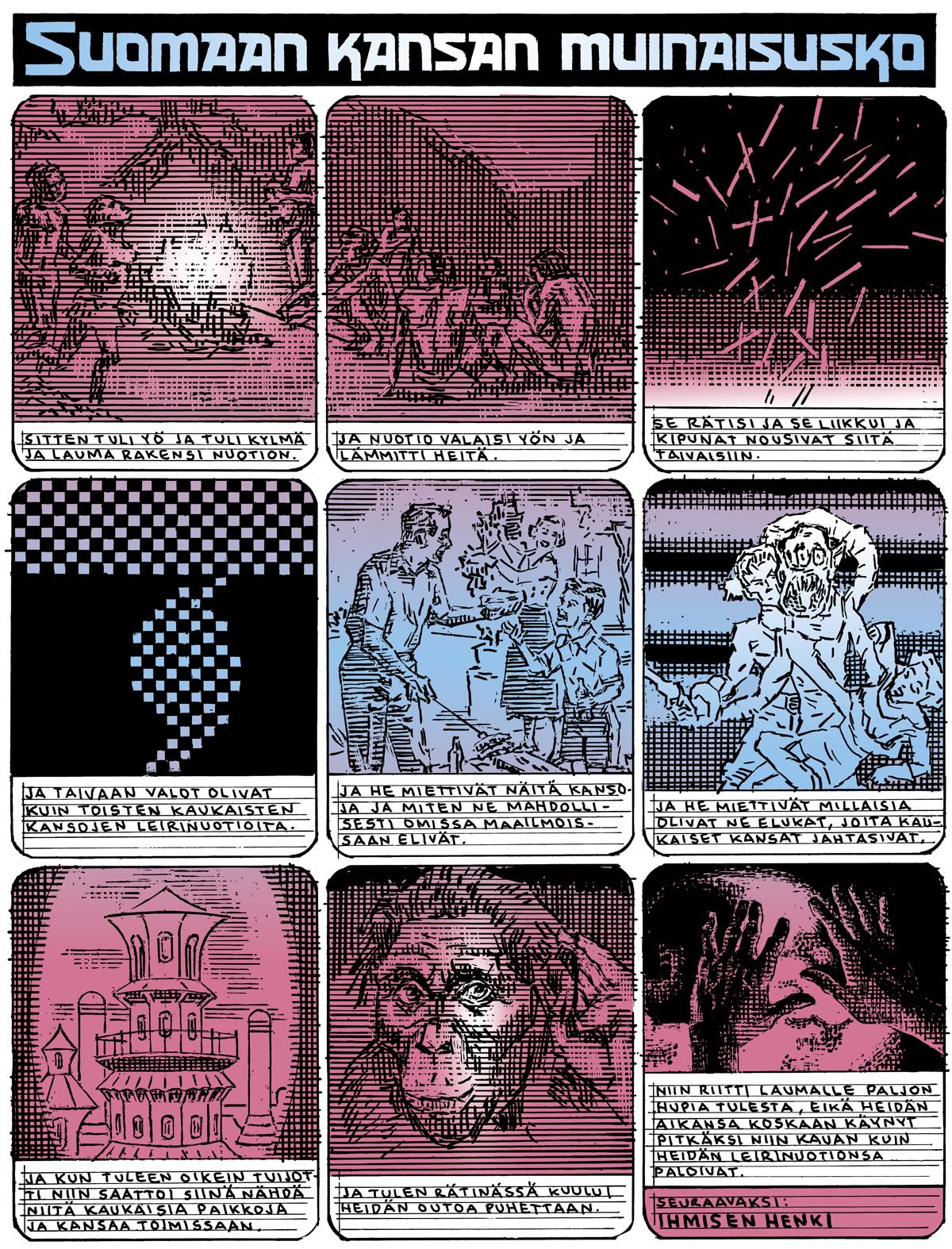 Hyvä elämä Suomaan kansan muinaisusko, osa 13: Nuotion laittaminen 19.07.2018 08:45 Matti Hagelberg Jaa tämä artikkeli: Toimitus suosittelee Suomaan kansan muinaisusko, osa 16: Kivisilmäjumalan ehdoton kielto Hyvä elämä 13.9.2018 Suomaan kansan muinaisusko, osa 15: Ihmisen liha esi-isien mailla Hyvä elämä 31.8.2018 Suomaan kansan muinaisusko, osa 14: Ihmisen henki Hyvä elämä 15.8.2018 Suomaan kansan muinaisusko, osa 12: Kiistaa tulesta Hyvä elämä 21.6.2018 Suomaan kansan muinaisusko, osa 11: Tulen salaisuus Hyvä elämä 6.6.2018 Suomaan kansan muinaisusko, osa 10: Asioiden nimeäminen Hyvä elämä 24.5.2018 Matti Hagelberg tekee sarjakuvaa niin kuin kertoisi tarinaa leirinuotiolla Hyvä elämä 17.1.2018