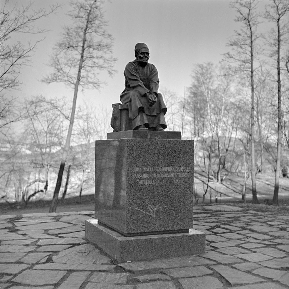 Kuvanveistäjä Alpo Sailo teki Larin Paraskea esittävän veistoksen 1936 suunnitteilla olleeseen Kalevala-taloon, jota ei kuitenkaan rakennettu. Keskusosuusliike Hankkija lahjoitti veistoksen Helsingin kaupungille ja se sijoitettiin Kansallismuseon lähelle 1949. Jalustassa on teksti "Suomalaiselle talonpoikaisnaiselle kansanrunon ja kansatietouden taitajalle ja tallettajalle". Kuva: Helsingin kaupunginmuseo