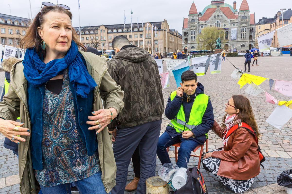 Lastenkirjailija Katri Tapola on käynyt turvapaikanhakijoiden mielenosoituksessa kuluneesta talvesta lähtien. Ihmisiin tutustumisen myötä Rautatientorin "demosta" on tullut tärkeä paikka, jossa vierailu tuntuu luontevammalta kuin piipahdus ostoskeskuksessa.