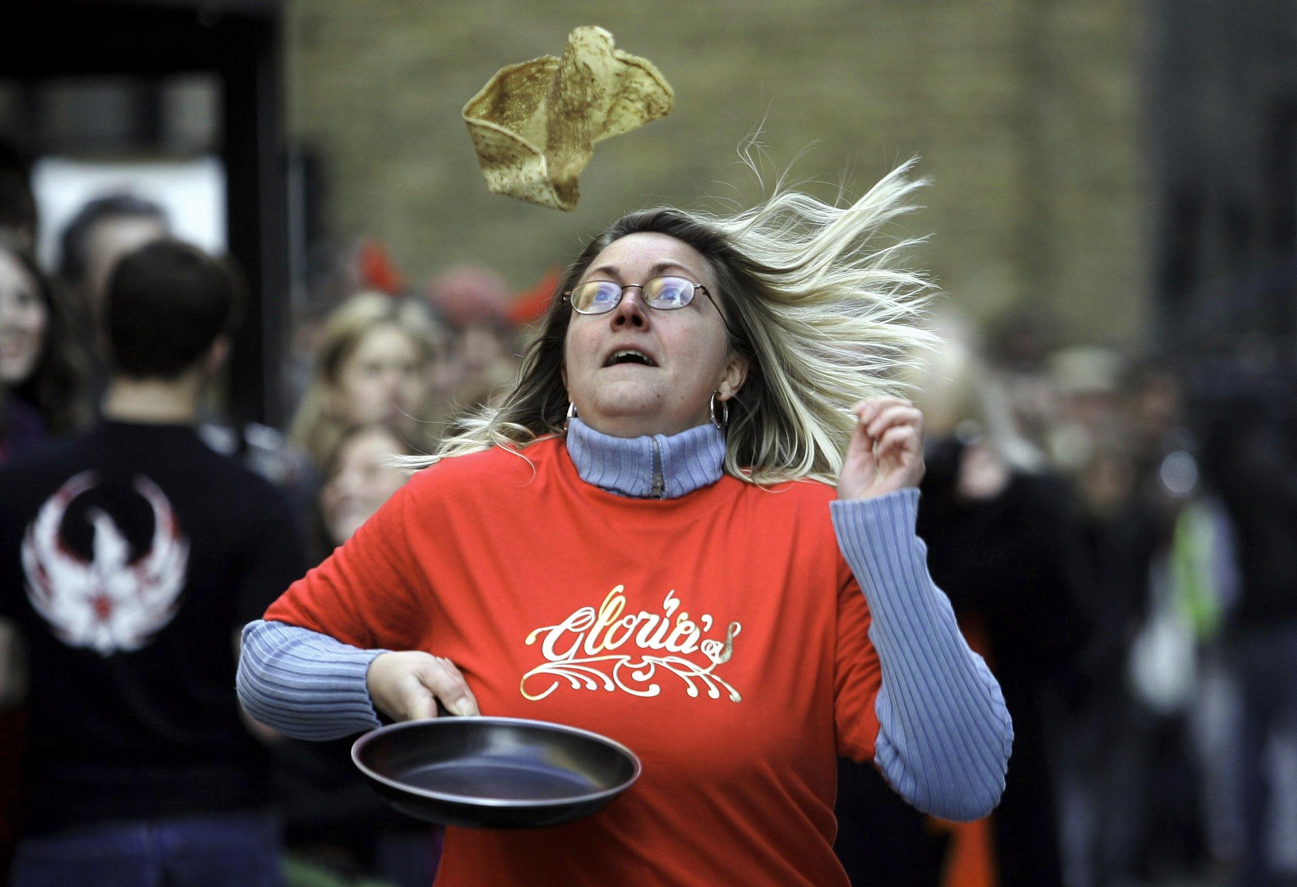 Briteille ja irlantilaisille laskiaistiistai on letunpaistopäivä, Pancake Tuesday. Lettupannun kanssa juostaan myös kilpaa. Kuva: Adam Butler/AP Photo/Lehtikuva.