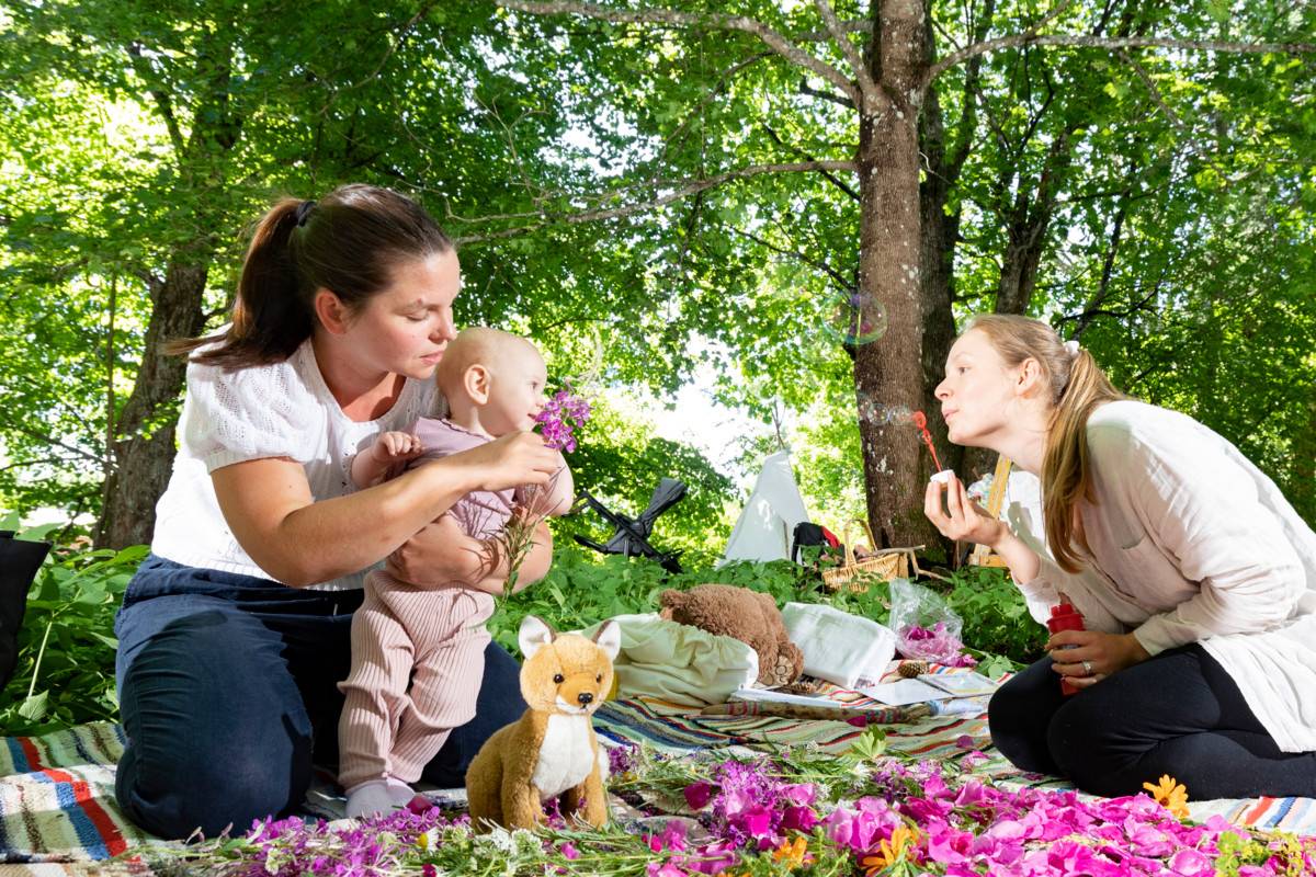Vauvojen luontokylvyssä vauva tutkii luontoa kaikilla aisteillaan. Kuvassa Elle Saari äitinsä Nina Virkkalan ja ohjaaja Raakel Silvennoisen (oik.) kanssa.