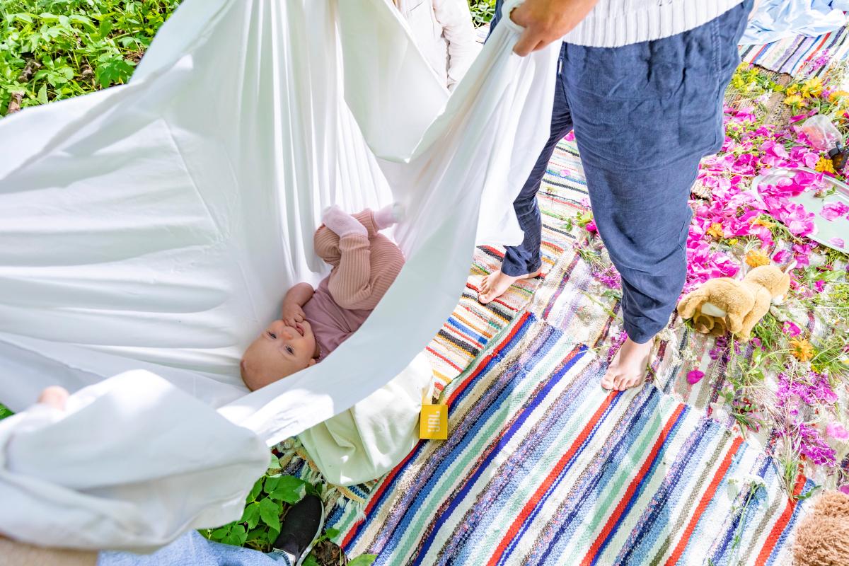 Vauvojen luontokylvyssä leikitään kukkien päällä, musisoidaan luonnonmateriaaleilla ja keinutaan lakanan sisässä