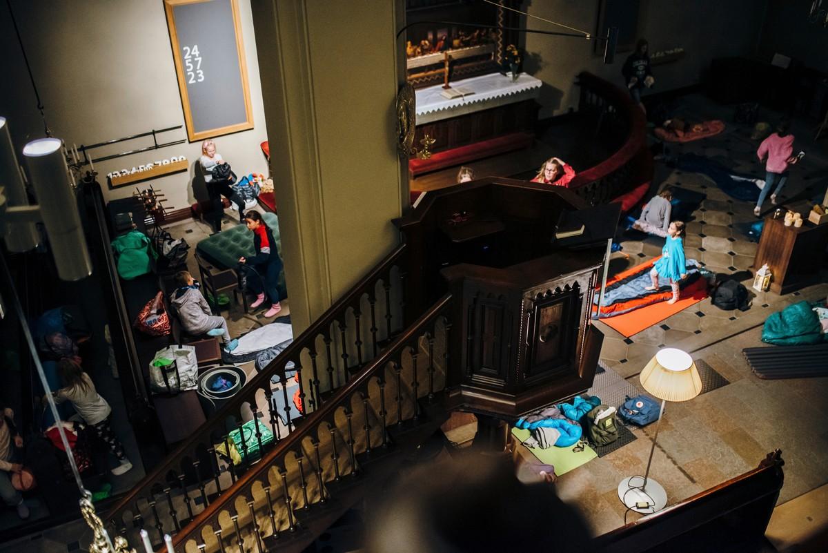 Tehtävärastit vievät eri puolelle kirkkoa ja auttavat tutustumaan erikoiseen yöpymispaikkaan.