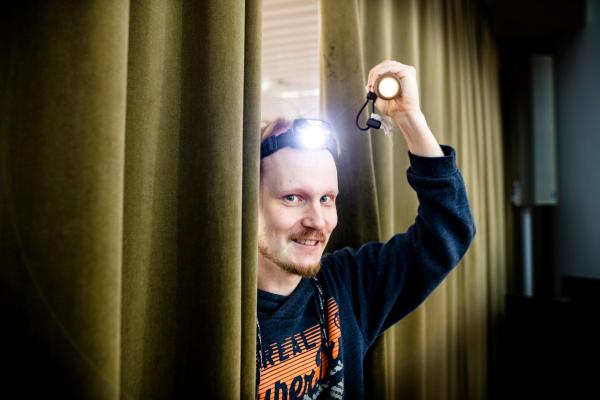 Pimeän piilo -leikin aluksi testataan, että taskulamput toimivat.