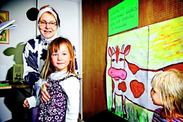 Pyhän Annan lastenkirkossa tehtiin käpylehmiä, lypsettiin leikisti ja nostettiin maitomaljoja.